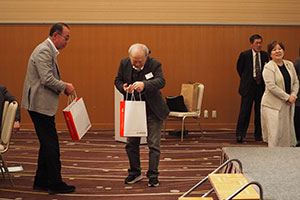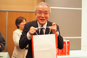 今回も紫藤正行氏 (昭和49年・商・大黒自工(株)代表取締役)、檜森支部長、西原幹事長から賞品の寄贈がありました。